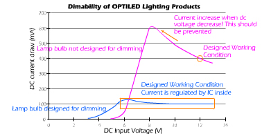 Not all lighting prodcuts is designed for dimming function. Dimming a non-dimmable LED lighting product will cause un-predictable result and may affect the life time of the products. The below figure shows the typical input current variation while adjusting the DC voltage input to dimmable and non-dimmable product.
